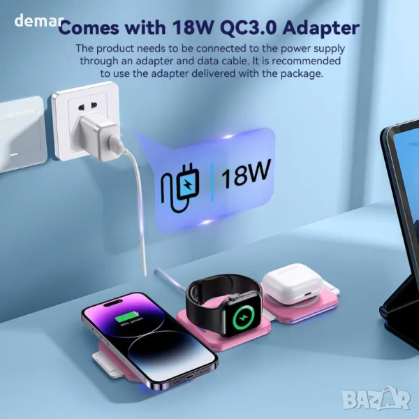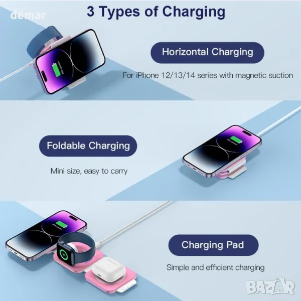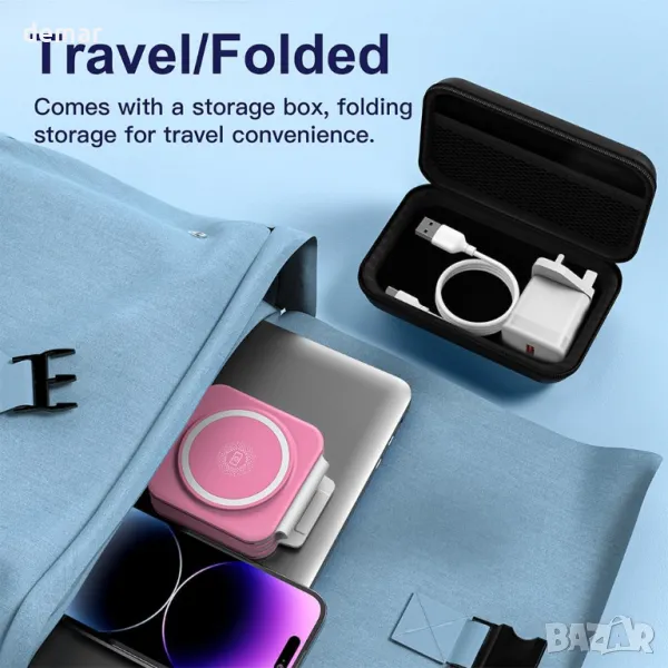Зарежда вашия телефон, iWatch и AirPods едновременно, елиминирайки бъркотията от кабели. Действа като държач за телефон, докато се зарежда (за серия iPhone 14/13/12 или магнитен калъф). Компактен, сгъваем дизайн, идеален за пътуване; спестява място и избягва повреда по време на транспортиране. Предлага се с 18 W QC3.0 адаптер и Type-C кабел, множество сертификати за безопасност и различни защитни функции за бързо и безопасно зареждане. Съвместим с набор от модели iPhone и Samsung Galaxy, както и Apple Watch и AirPods (с изключение на AirPods 1 и Samsung Watch).