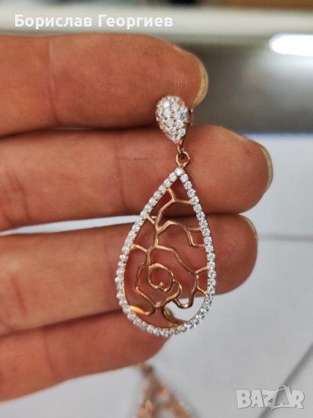 Комплекта е с проба 925 и отгоре е с позлата.Размер на обеците и висулката 46 мм.