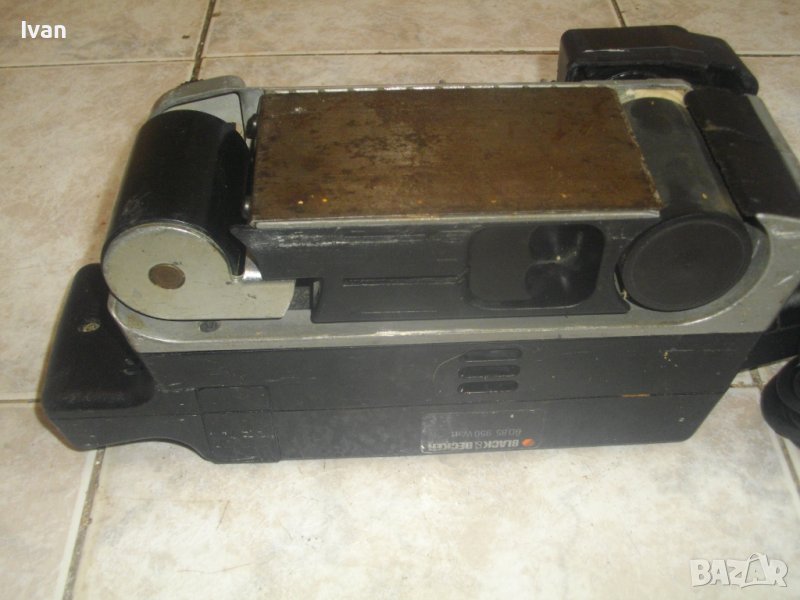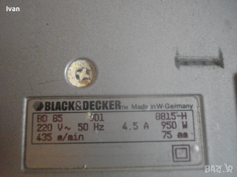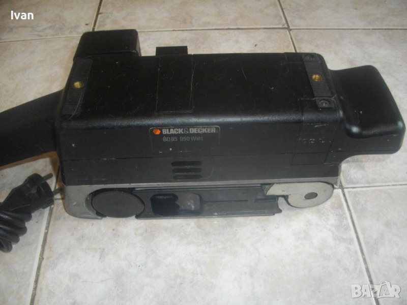 ОПИСАНИЕ на черен голям лентов шлайф - 950 вата - Блек Декер - цена 199 лв. Старо качествено произовдство на марката в Западна Германия. Марка и модел - Black Decker BD 85. Маркирано производство - W.Germany. Мощност на мотора - 950 вата, скорост голяма 435 м/мин. За шлифовъчни ленти/пояси/шкурки ширина 75 мм. Запазен външен вид. Автостоп на спусъка. Конектор външен на отпадъчна прах. Предна дръжка еднокомпонетна заедно с корпуса. Бакелитова ролка за придвижване на шкурката. Гумирана повърхност на заден амортисьор от масивна инпрегнирана гума. Лентовият шлайф от обявата е със ЗАБЕЛЕЖКА. Работи много силно и мощно, няма никакво искрене от ниво четки/ротор, движи добре шкурката, но ремъка леко излиза от от зъбните колела и се впива в пластмасовата капачка над него. Предполагам, машината е скъсала ремък и са закупили този, който е поставен, но явно е леко по-дълъг или пистите на него не влизат добре в зъбните колела. Ниската цена на машината 199 лв. е съобразена със забележката. Мога да дам оригинален ремък от същия модел машина, но ще покача цената на 279 лв.