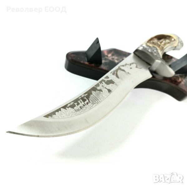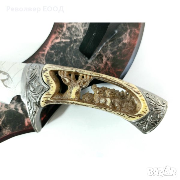 Изящността на ножа е силно подчертана от неговата дръжка с гравирано 3D изображение на елен.