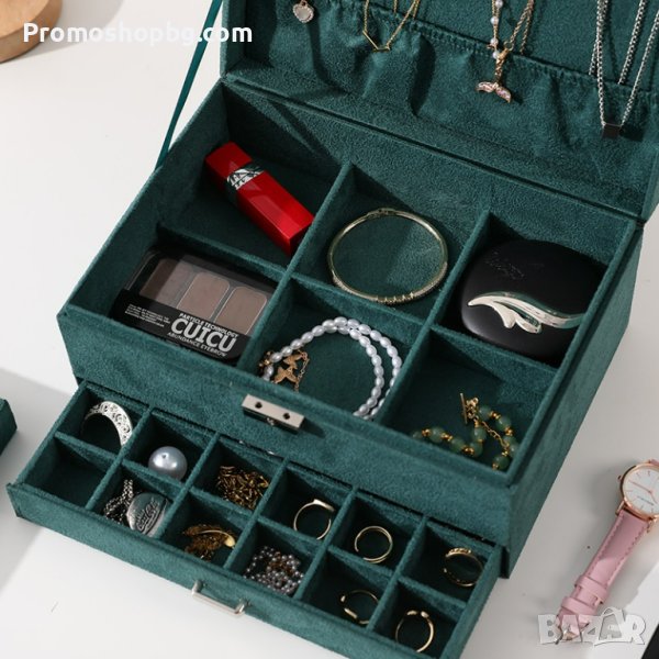 Кутията за бижута ви позволява да организирате ефективно колекцията си. Разполага с различни размери отделения и джобове, което улеснява съхраняването на всички видове бижута, като пръстени, колиета, гривни, часовници, обеци и т.н. По този начин можете лесно да намерите и изберете подходящото бижу, което да носите.