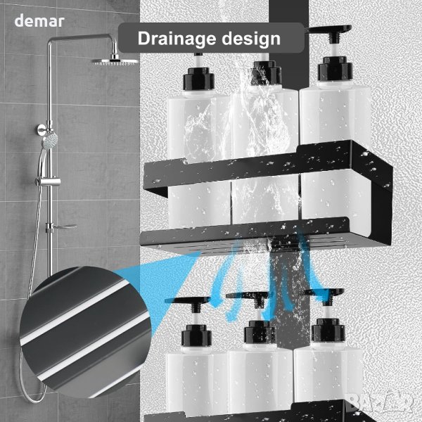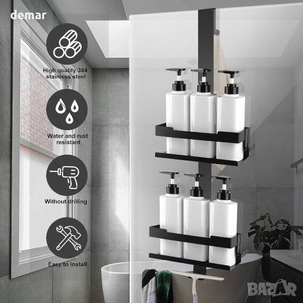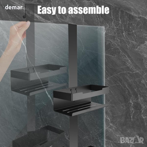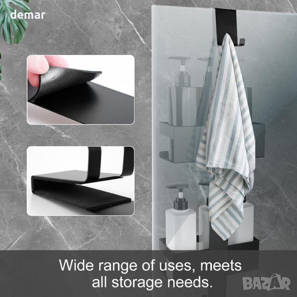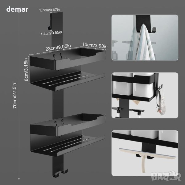 Ширината на куката за окачване е около 12 мм, подходяща за душ врати с дебелина до 12 мм, моля, измерете вратата си преди да поръчате. Душ кош: 23*10*8 см ; Дължина на окачваща плоча за рафт за душ: 70 см. Не е необходимо пробиване, просто окачете душ рафта на душ стъклото. Ако искате рафтът да приляга плътно към вратата, можете да използвате стикерите, приложени към рафта, за да ви помогне да го закрепите към вратата. Изработен от неръждаема стомана, издръжлив и устойчив на ръжда. Макс. товароносимост на всяка душ кошница: 5кг. 2 фиксирани куки от двете страни на рафта за лесен достъп до кърпи и халати след душ. Могат да се използват и за чистачки за душ, гъби за баня, самобръсначки и др. 4 подвижни куки за закачане на повече неща. Матово черно покритие, стилно и елегантно. Кух дизайн на дъното за избягване на застояла вода. Двойните слоеве осигуряват повече място за съхранение, чисти и подредени.