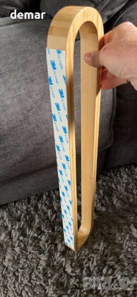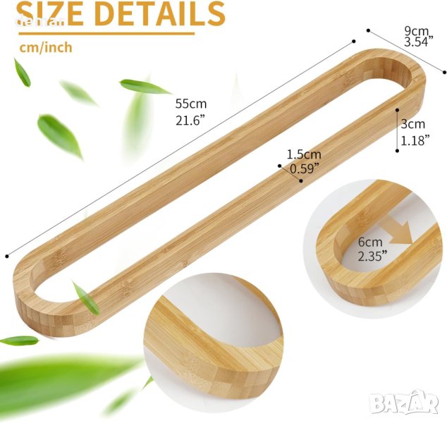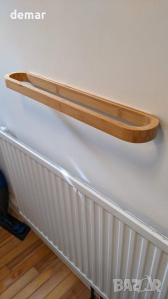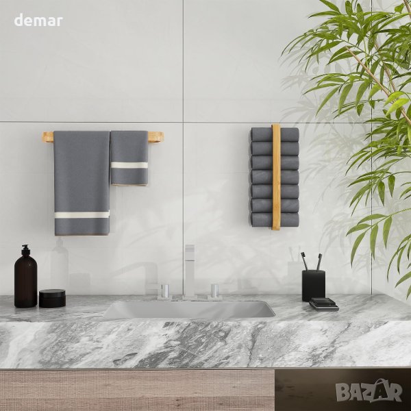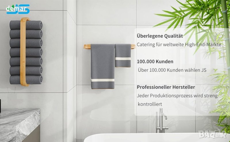 бамбук. Използването на бамбук щади околната среда и същевременно предлага ТОП визия! Благодарение на запечатаната повърхност, пръскащата се вода се търкаля и не оставя водни петна. Просто избършете влагата от нея! Вижте как закачалката за кърпи на JS се представя във вашата баня, баня за гости или кухня. Уникалният дизайн прави закачалката за хавлии наистина привличаща вниманието и придава на вашия дом висококачествен и модерен вид от самото начало. Използвайте изправено или окачено напречно. Побира до 5-7 кърпи, от по-големи за баня към по-малки кърпи за ръце. Залепващия пръстен трябва да се монтира върху гладка повърхност, като плочки, стъкло, метални повърхности и др. Натиснете за няколко секунди, изчакайте 24 часа, преди да окачите нещо.