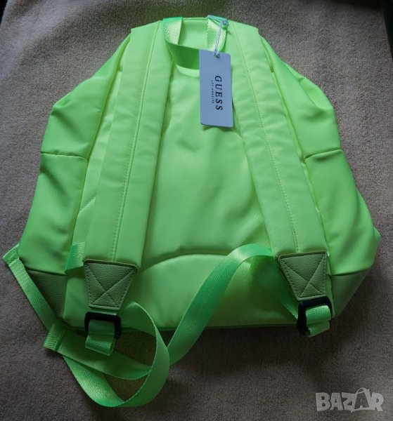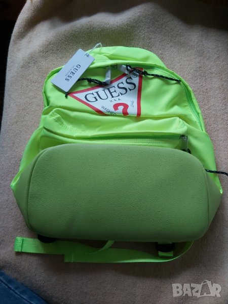 Раницата е чисто нова с етикет. Раницата е марка GUESS. Моделът на раницата е BACKPACK H3YZ00. Раницата е цвят зелен неон. Раницата има едно голямо вътрешно отделение и едно малко външно отделение. Раницата събира формат А4. Раницата има цип за закопчаване. Раницата има дълги регулируами презрамки. Раницата има и къса дръжка за носене в ръка. Височина на раницата е 38 см., ширината на раницата е 31 см., а дълбочината на раницата е 17 см. Цената която и искам е 53,00€. Лично предаване в град Смолян, а извън град Смолян извършвам доставка с Еконт или Спиди /по желание на клиента/. Доставката е от 2 до 7 работни дни и е за сметка на клиента.