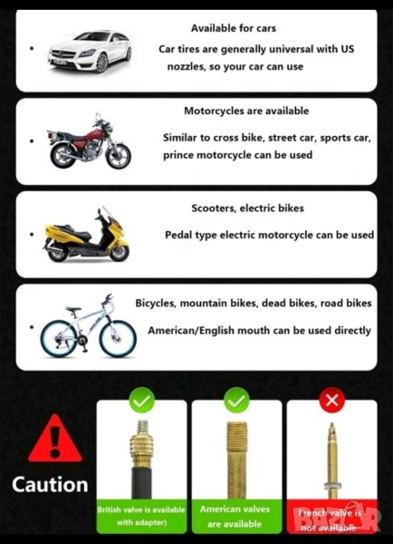 -Съвместими с повечето видове гуми и вентили, което ги прави универсално приложими за почти всички автомобили.