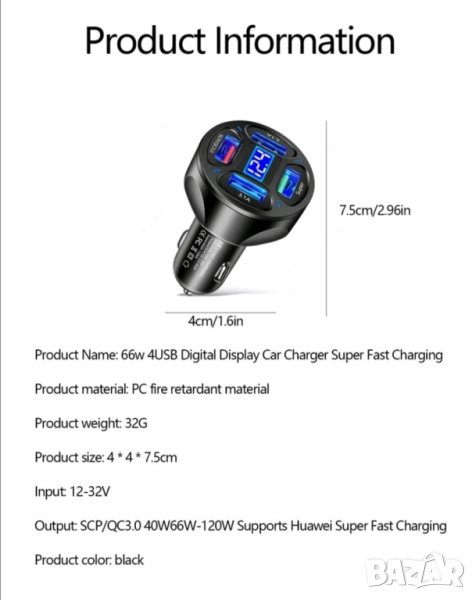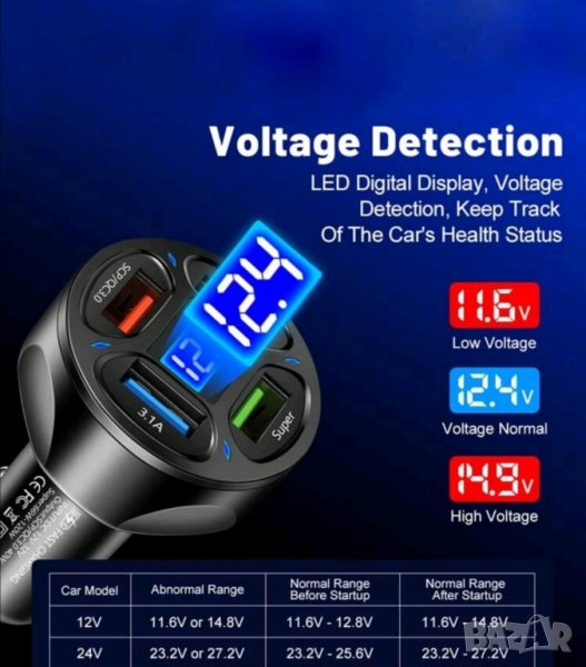 Зарядно за кола с 4 интелигентни USB порта и волтметър