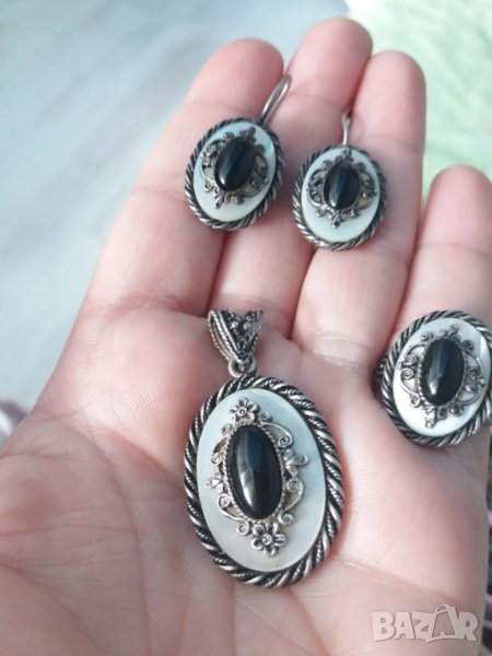 Сребърен комплект-обици, пръстен с диаметър 18 мм и висулка.Налични печати 925.Сребро, оникс и седеф. Крайна цена!