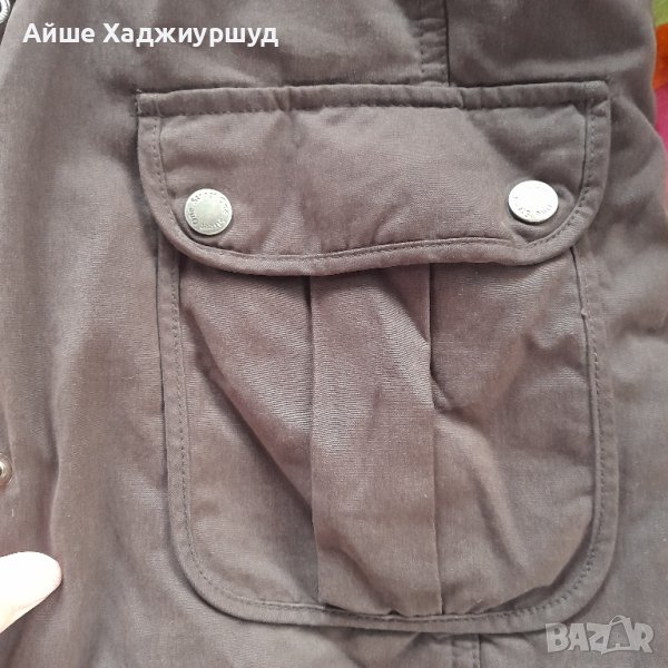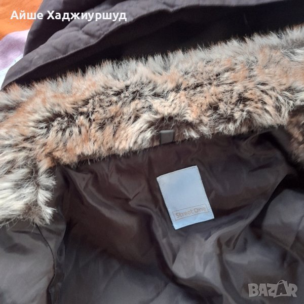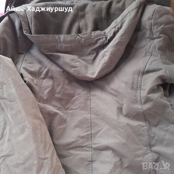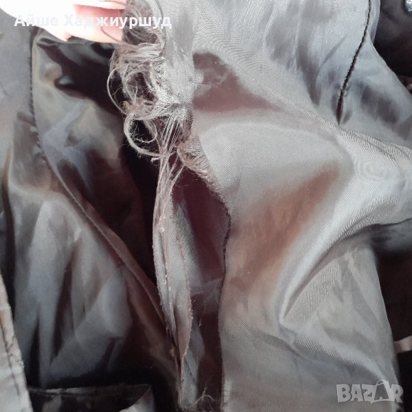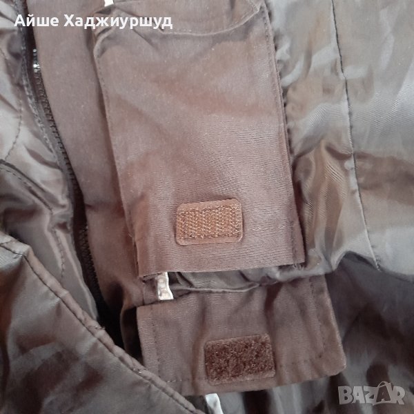 Дамско многофункциално яке,цвят тъмнокафяв, два предни джоба,поларена качулкана цип,която може да се махне.Подплатата на якето е от тънка вата,с изкуствен косъм по краищата и яката,която също може да се сваля,р-р 40- ти.Единствена забележка е че има разпорен хастар на единия ръкав и цената е съобразена с това( последната снимка).