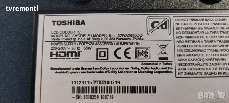 борда е гарантирано работещ Демонтиран от телевизор TOSHIBA модел 32WA2063DG със счупен дисплей VES315WNGH-2D-N51 тесвана от нашия техник