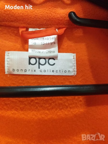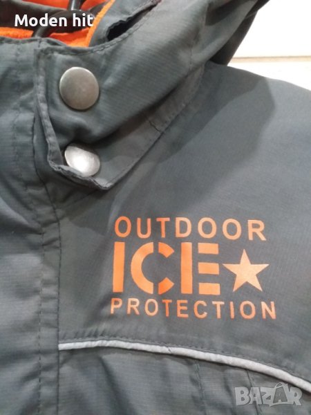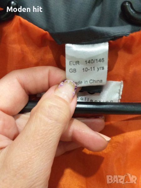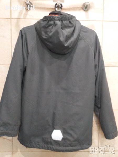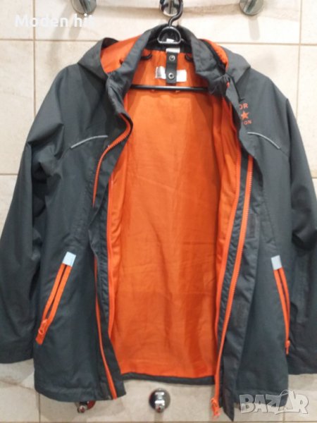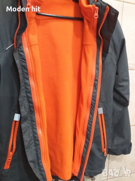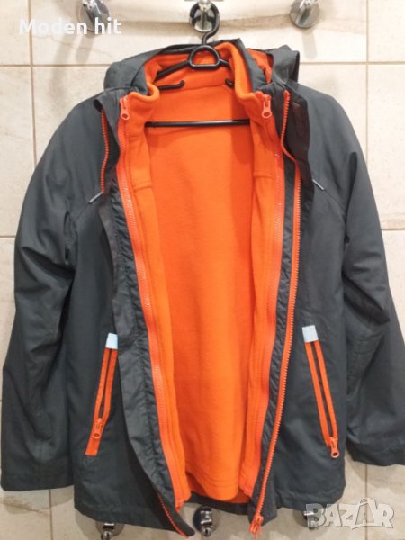 Яке с качулка 2 в 1. Непромокаема материя с поларена подплата, която се сваля изцяло и може да се ползват отделно. Без подплатата якето става ветровка. С подплатата е подходящо дори и за по-топлите зимни дни. Поларът е дебел. Цветовете са тъмно сиво и оранжево. По етикет е размер 140/146 см., 10-11 г.