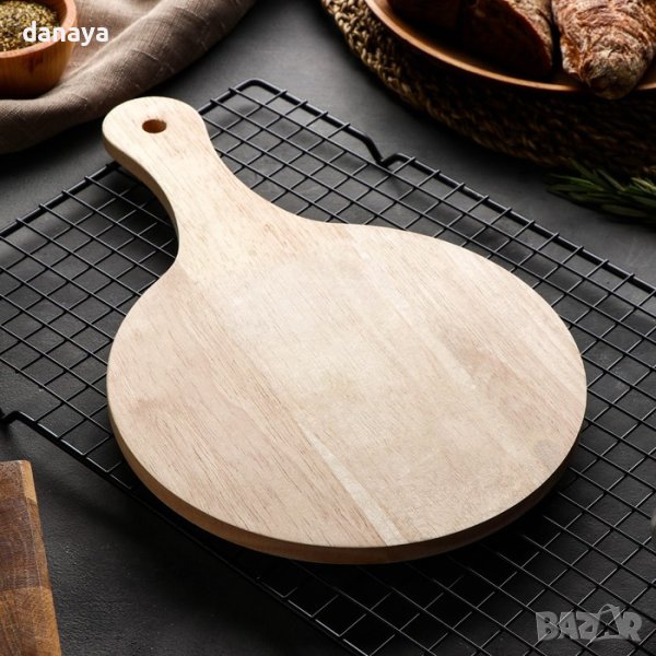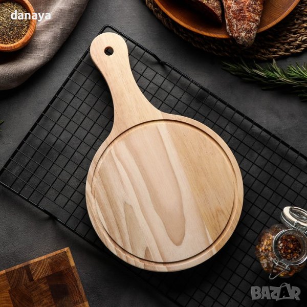 Дъска за сервиране. Кухненска дъска за рязане на зеленчуци, плодове, продукти за ястия. С удобна дръжка за сервиране на мини пица, сирена или други мезета. С дупка за закачане, когато не се използва. Изключително компактна и удобна кухненска вещ.