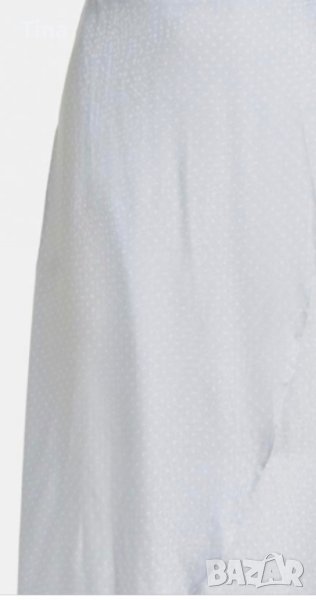 Рокля Guess с прехвърляне. Цветът е много нежно светло синьо на едва забележими бели точки.Материята е лека, много леко сатенирана, непрозрачна.