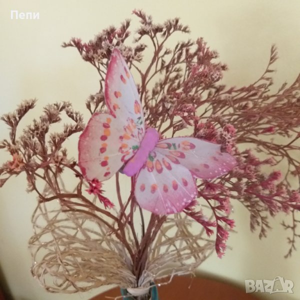 Ръчно изработена, керамична ваза(троянска керамика). Висока 18 см. Продава се с цветята. Пеперудата е закрепена с щипка.