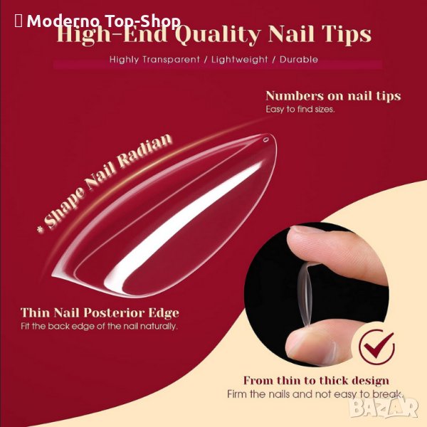 Изработени от акрил гел типси във форма Бадем. Всяка кутия съдържа 264 бр. типси в 12 размера, за да подберете най-подходящата ширината за нокътната плочка.