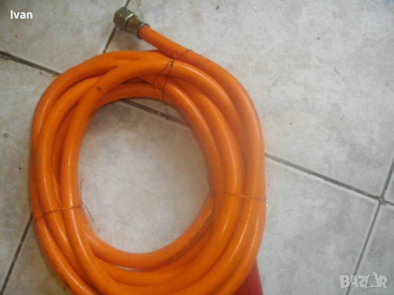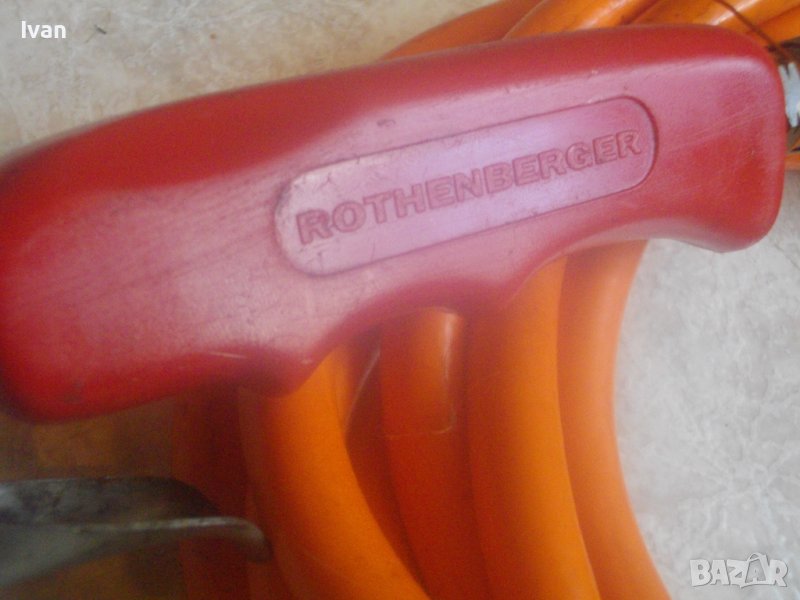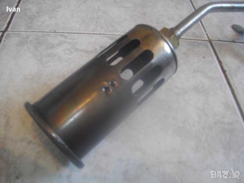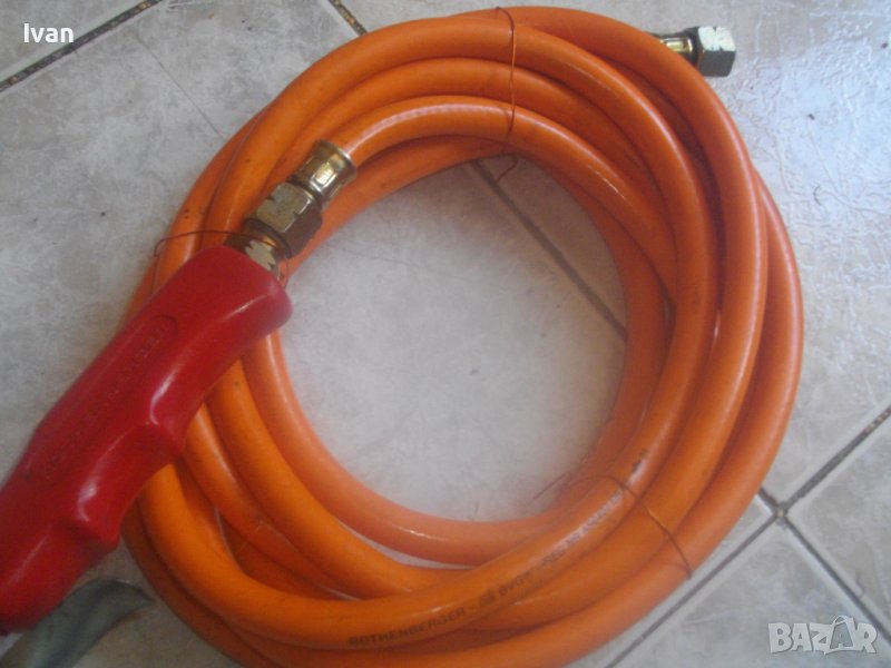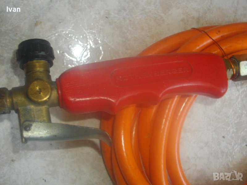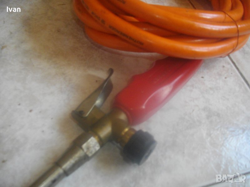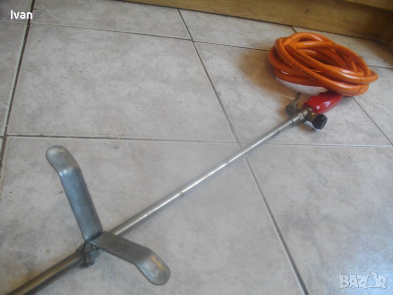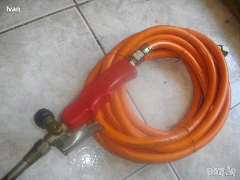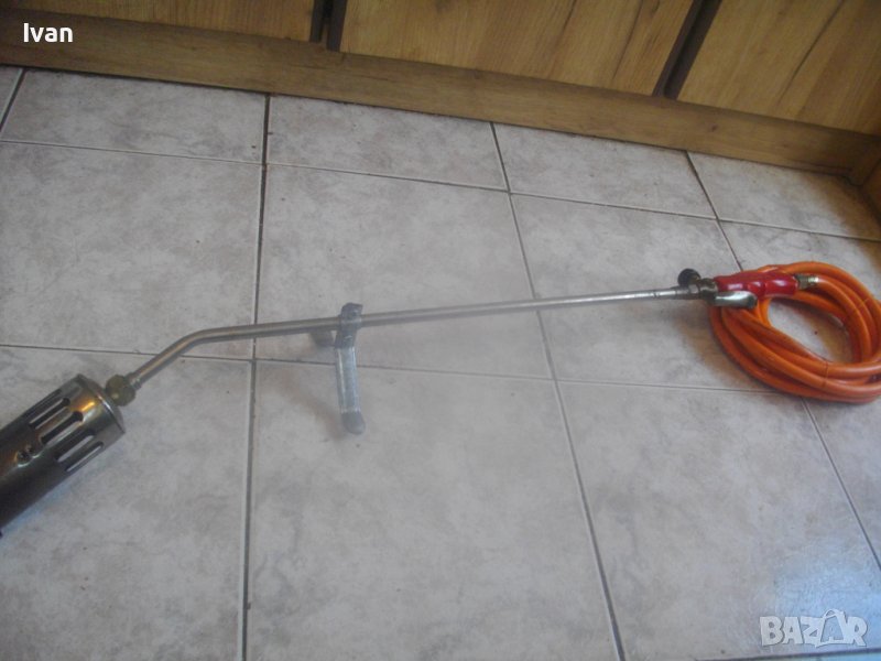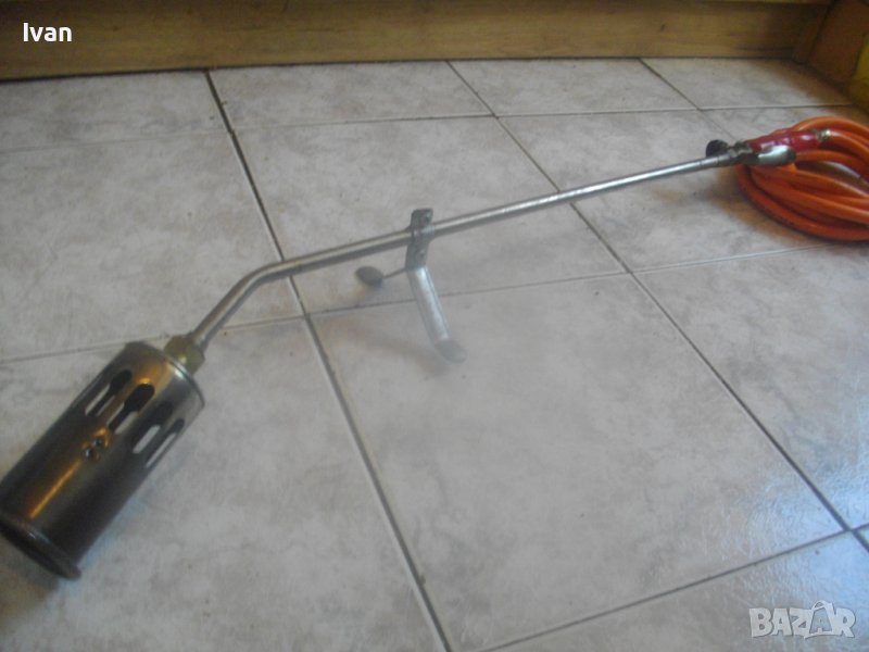 ОПИСАНИЕ на газова горелка Ротенберегер 92 см . Марка ROTHENBERGER - оригинална немска на марката. Дължина горелка 92 см. Чашка ф 75 мм, дължина 12,5 см, с 8 дупки за пламъка. Метален спусък, спирателен кран. Маркуч оригинален на марката с дължина 5 м. в отлично състояние със съединителна гайка. Горелката е със запазен външен вид и отлочни техническо/работно състояние. Без редуцир вентил към маркуча. Налична е оригиналната стойка метална за самостоятеелеен стоеж на рамото тръба на горелката. Комплекта е почти нов.