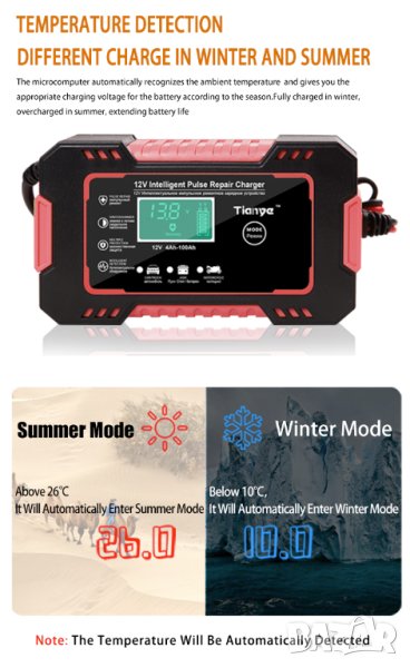Напълно автоматично умно импулсно зарядно с опция за поправка на сулфатизиран акумулатор. 3-степенно универсално умно зарядно устройство за различни видове акумулатори на 12V – Тягов, AGM, GEL, VRLA, EFB, мокри, стартови, калциеви. Зарядното устройство разполага с LCD дисплей, както и с функция за десулфатизация на сулфатизиран акумулатор, което може да вдъхне “нов живот” на вече “отписан” акумулатор.