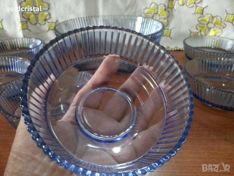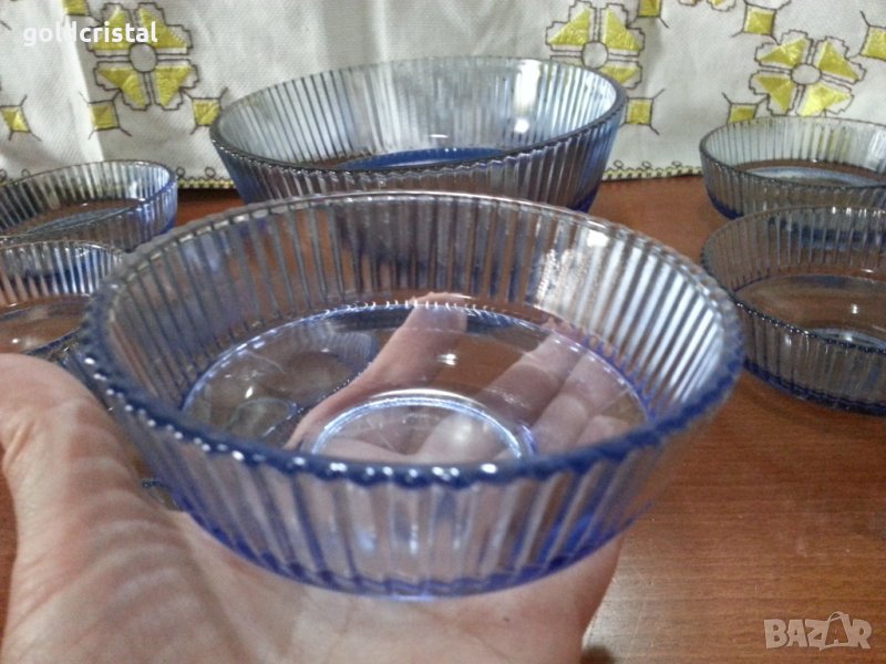 Ретро стъклени купички и купа фруктиера цветно лилаво стъкло купички 6 броя без забележки неизползвани сервиз комплект сет лот ретро арт декор винтидж колекция стари антикварни предмети обзавеждане за дома и семейството подходящи за подарък за ценители и колекционери