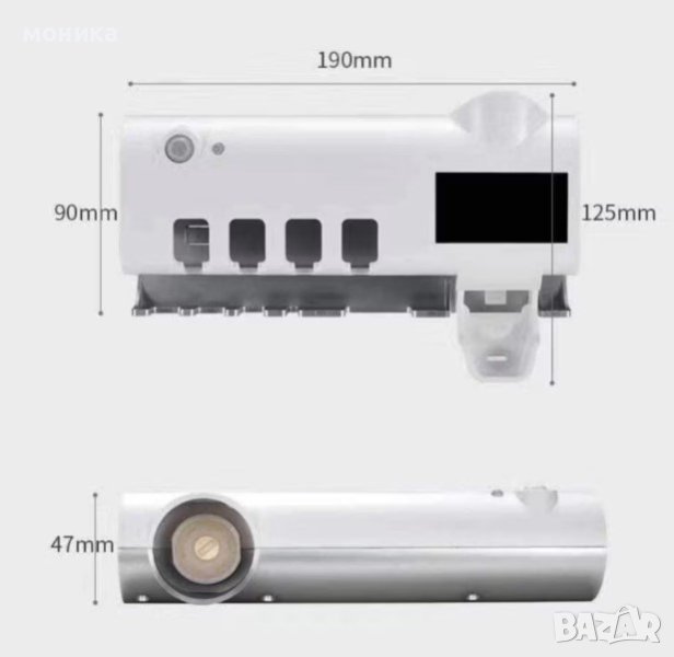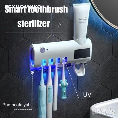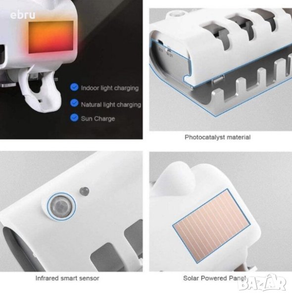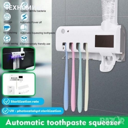 детектор за близост, автоматично ще се изключи, когато някой се приближи, този дизайн може ефективно да предпази потребителя от увреждане, причинено от UV светлина. Когато излезете, диспенсърът автоматично ще започне да работи в режим. ОСОБЕНОСТИ:Диспенсърът е с двойна високоефективна двойна стерилизация. Двойната стерилизация е с UVC и фото катализатор, който повишава степента на стерилизация до 99,99%. Бъдете сигурни, че с него ще използвате точно толкова паста за зъби, колкото ви е нужно, освен това всички микроби по четките ви ще бъдат унищожени ефективно. Върху диспенсъра можете да съхранявате четири четки за зъби, та дори и самобръсначка. Половината от оралните проблеми са свързани с вашата четка за зъби. Върху нея лесно се развиват бактерии, които са в основата на тези проблеми, особено ако се съхранява във влажна среда за по-дълго време. Продуктът може ефективно да почисти микроорганизмите, останали по повърхността на главата на четката за зъби, за да предотврати заболявания на венците, кариес и други подобни.Соларният диспенсър може лесно да се инсталира върху различни стени. Няма да изпитате никакви проблеми с монтажа. Диспенсърът ще залепне здраво за всяка гладка повърхност, като стъкло, керамика или пък мрамор. Задължително почистете и подсушете повърхността преди да залепите диспенсъра. Артикулът е изработен от висококачествена и здрава пластмаса, благодарение на което той ще ви служи вярно дълго време. Тя е напълно безопасна за вашето здраве. Почиства се лесно. Диспенсърът е проектиран с UV стерилизатор за дезинфекция на вашата четка за зъби преди и след употреба.ДИЗАЙН:Продуктът е с безжичен дизайн. Може да се използва без щепсел, което ще премахне възможността да се спънете в поредния кабел или пък да натоварите електрическата си мрежа. Продуктът се зарежда чрез соларен панел, а при нужна можете да го захраните и с USB кабел, който е включен в комплекта. Диспенсърът може да се презарежда ефективно при всякаква светлина, включително вътрешна и естествена. Може да работи повече от три месеца при пълно зареждане. Диспенсърът е с компактни размери, благодарение на което можете да го инсталирате навсякъде и да се наслаждавате на подредена баня. Предлага се в бял цвят, така че да пасне на всеки интериор.ТЕХНИЧЕСКИ ХАРАКТЕРИСТИКИ:Материал – пластмаса;Размери – 19*12.5*4,7 см;Възможност за стерилизация – да;Захранване – соларен панел, литиево-йонна батерия 18650/ USB;Капацитет на батерията – 1200 Mah;Максимална мощност – 1.2 W;Цвят – бял.КАКВО ЩЕ НАМЕРИТЕ В ОПАКОВКАТА:Соларен диспенсър за паста за зъби;USB кабел.Изпраща се с Еконт