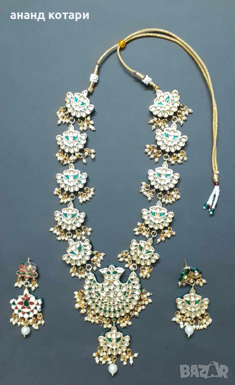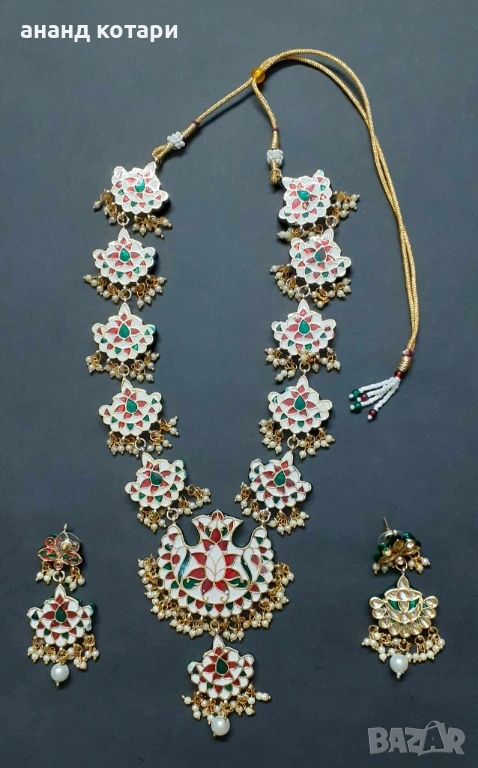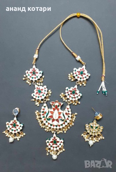 1-Р - Индийски емайлиран комплект. Традиционни бижута от щата Раджастан. Колие и обеци. На снимка 1 се вижда гърба на лявата обеца, който е цветен, по същия начин са обработени всички елементи от това уникално бижу!