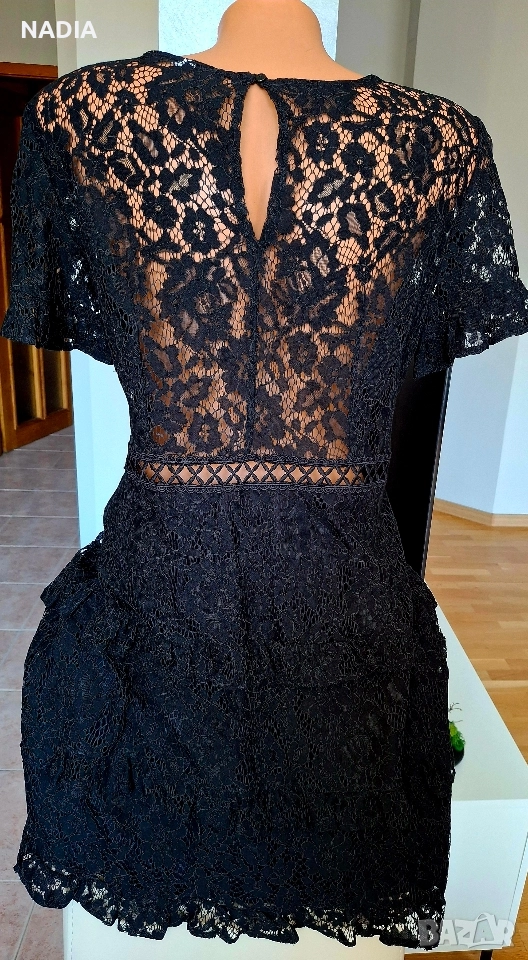 Черна рокля от хубава дантела. Горната част е с ефектни елементи.Долната част е леко А силует, малки воланчита.Дължина 91,от рамо до рамо 42,бюст 50,талия-висока 42,ханш 50