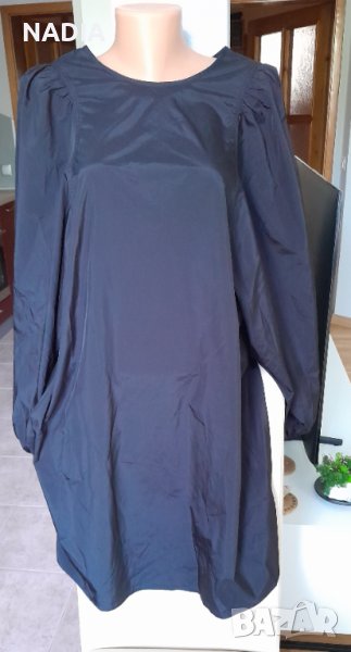 Черна рокля от тафта, уникален базисен модел. Дължина 92, ръкав 68, бюст 54, ханш 60.широк модел и стои свободно. Подходящ от М до XL.