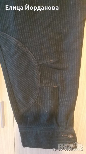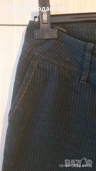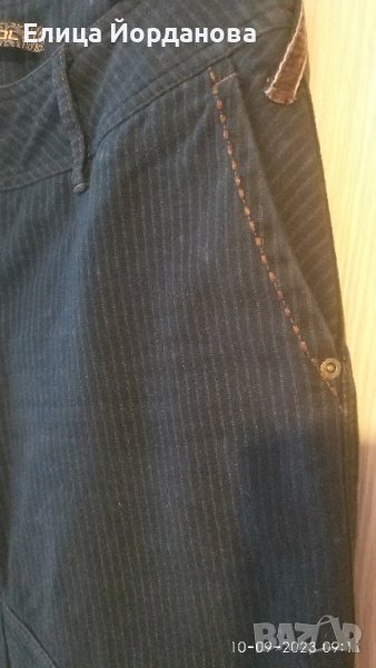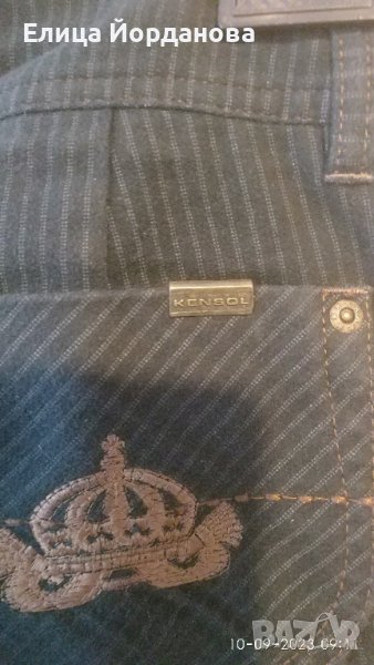 Нов дамски панталон Кенсол с дължина до около коляното.Интересен модел,може да се носи зимата с висок ботуш или боти,плътен, с копчета, интересни джобчета, има гайки за колан. Плата е релефен,но не е джинсов.Тъмно син на цвят (на снимката изглежда светъл).Размер 42 от българската номерация,което съответства на S размер. Има резервно копче, което си е зашито вътре.100% памук,много мек и в същото време плътен и подходящ за студено време.