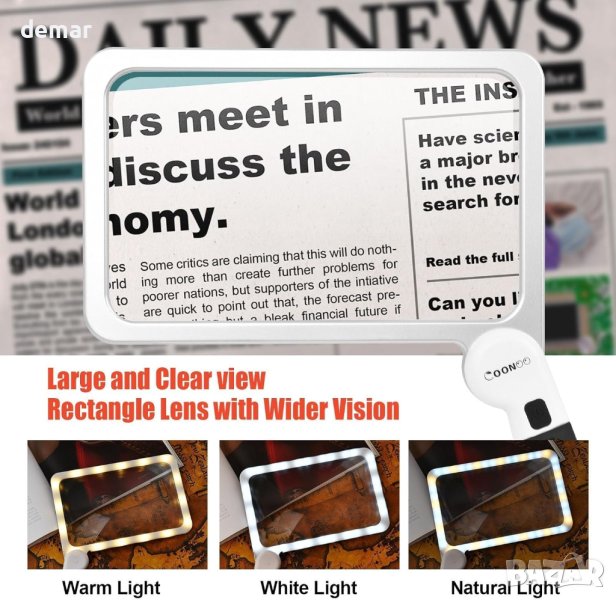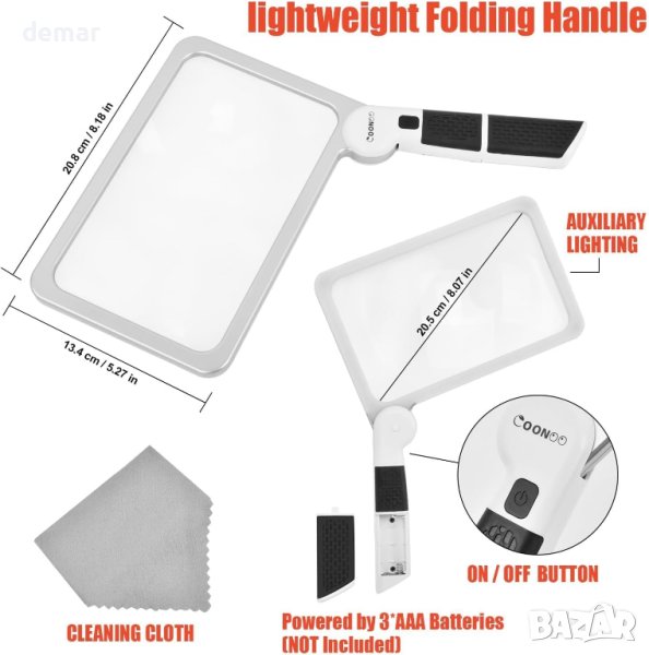 увеличителна леща с размери 21 x 13 см покрива широка зрителна площ и увеличава