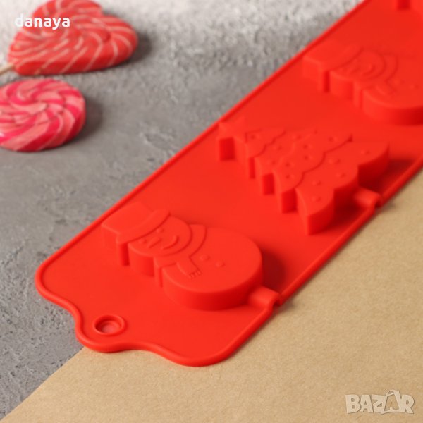 Коледна форма за ледени близалки или домашен сладолед на клечка. Силиконова форма за близалки на коледна тематика с форма на снежен човек и елхички. Формата има 4 гнезда и 4 пластмасови дръжки. Чудесна за приготвяне на шоколадови близалки, карамелени или желирани лакомства. Термоустойчива.