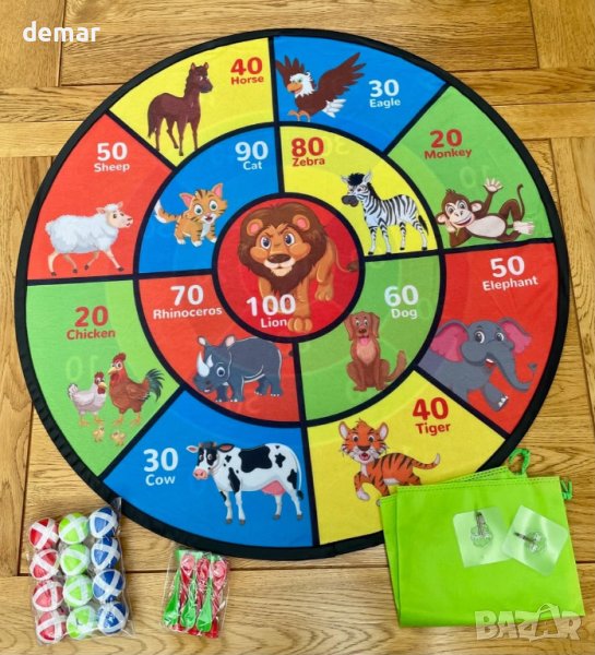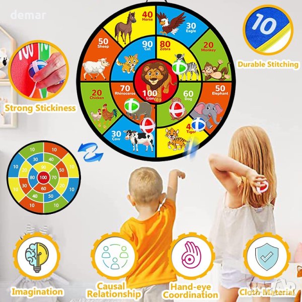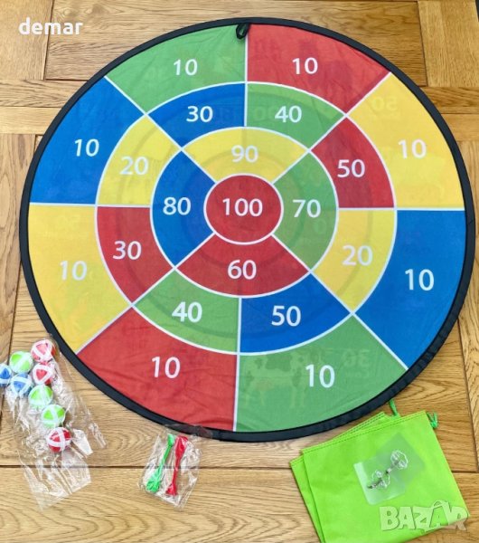 включва двустранна дъска за дартс 74 см, 12 лепкави топки, 6 лепкави стрелички
