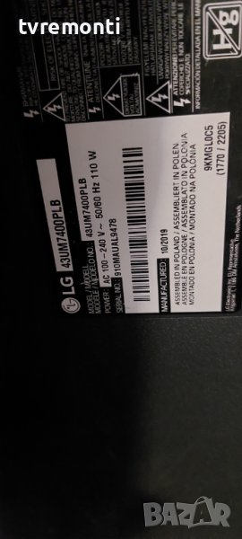 борда е гарантирано работещ Демонтиран от телевизор LG модел.43UM7400PLB със счупен дисплей HC430DQG-ABXL3-A144 тесвана от нашия техник