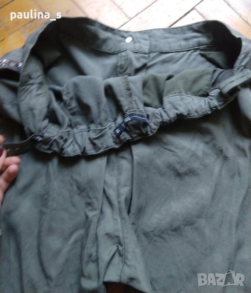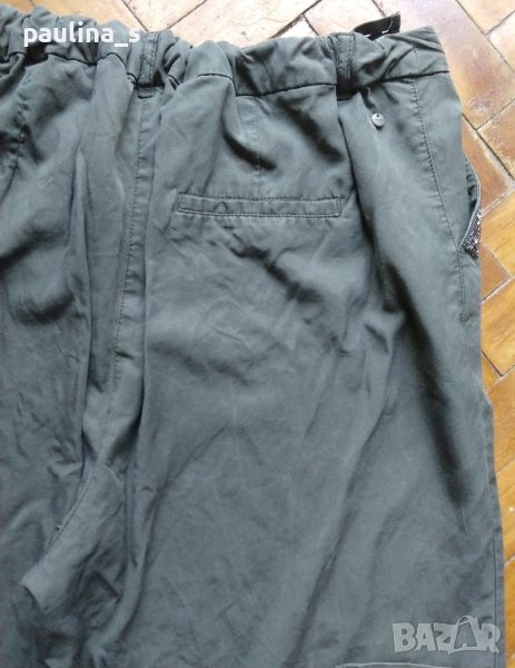 шалвари, имат коси предни джобове с декорации и страничен джоб. Наборът отзад на талията е за регулация, а на крачолите за шалвар, може да се носят от няколко размера, една бройка. Материята е лиосел, цветът е зелен с избелващ ефект. Уникални.