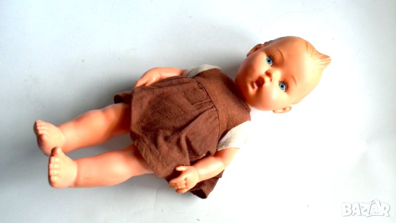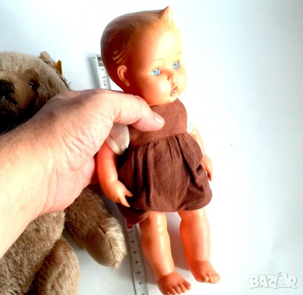 Немска ретро маркирана Hummel Goebel V кукла от винил-каучук с стъклени сини очи, формована коса и ръчно рисувани черти, началото на 60-те години на миналия век, с ръчно плетени дрехи. Тази немска ретро кукла бебе е рядка гумена кукла с надпис „V 104“ на врата