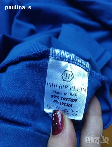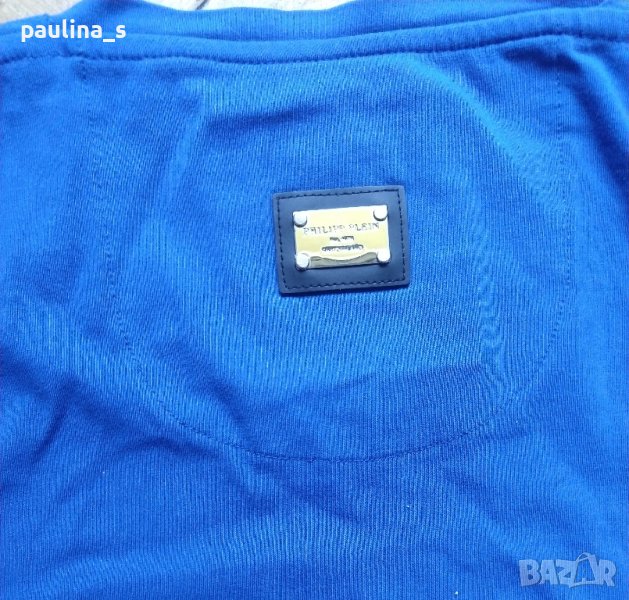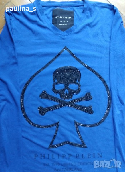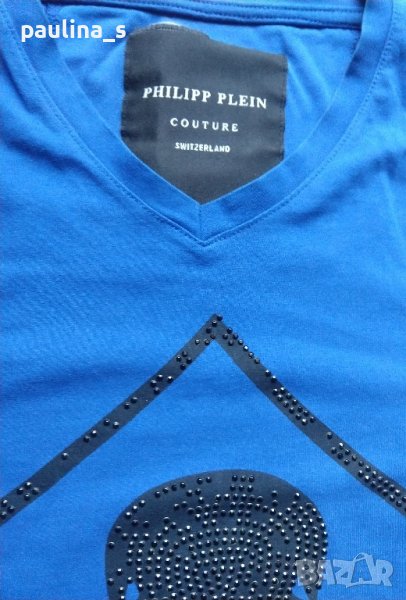 Philipp Plein". Мъжка дизайнерска блуза с дълъг ръкав в турско / кобалтово синьо. Без дефекти, но с липсващи камъчета на места, съобразена е цената. Една бройка, става за посочените размери.