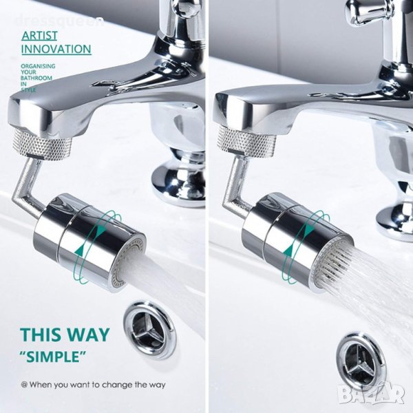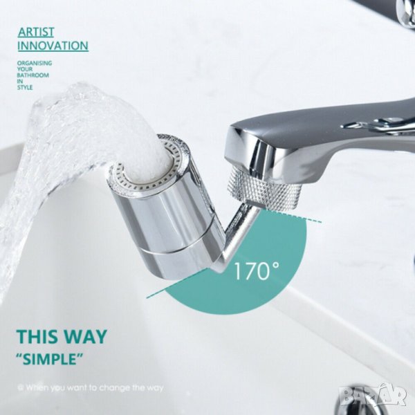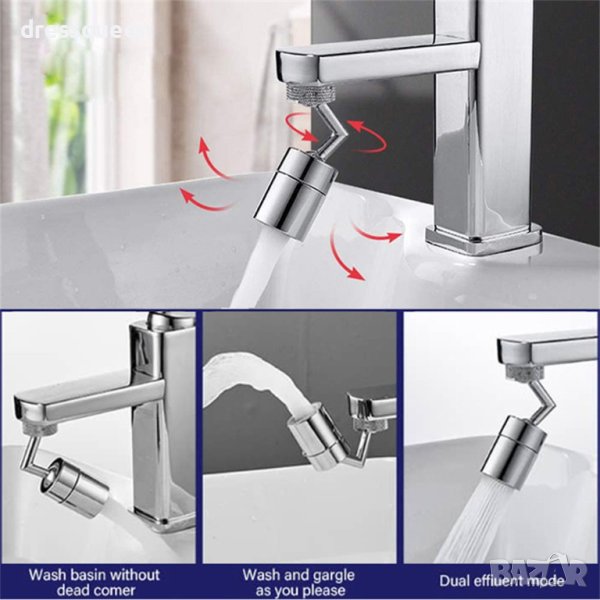 Подвижен накрайник за чешма с въртящ се механизъм на 720 градуса: Главата на крана се върти на 720 °, краищата се движат, ъгълът е широк и гладък, улесняващ измиване на лице и гаргара. Регулирайте ъгъла на крана за улеснено почистване на съдове, плодове и зеленчуци. Накрайникът има 2 променящи се режима струата на водата: директна струя и разпръскване.