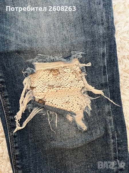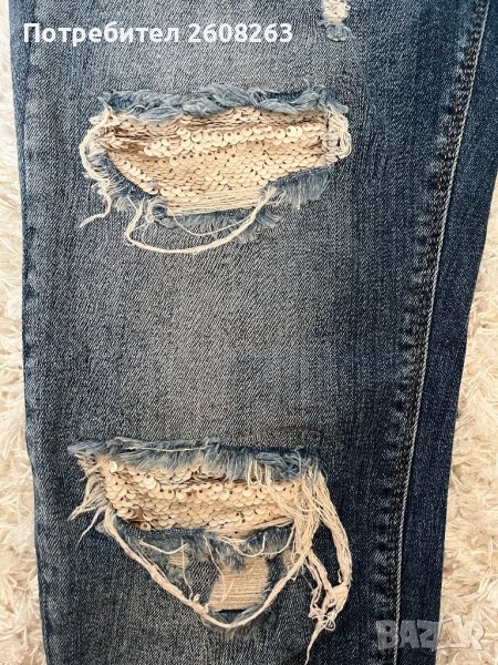 Дънки с интересни детайли. Размер ХС. Нямат абсолютно никакви забележки. Малко носени. Дължина 79 см, ширина в ханша 45 см.