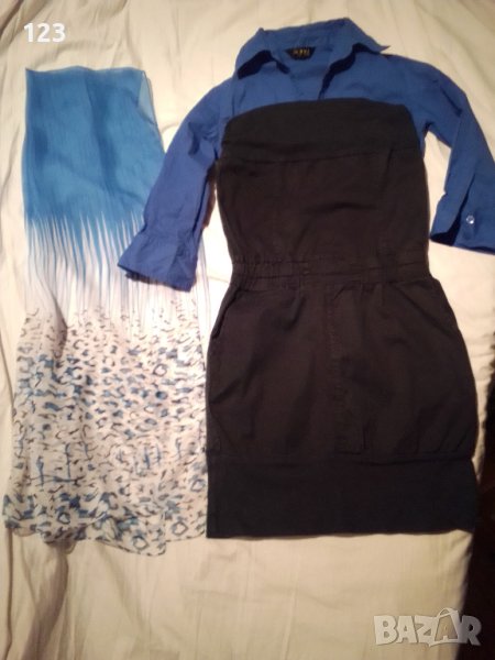 Платът имитира тип дънков, но фин, не дебел и груб, а в областта на бюста и долу е еластичен памучен. Така е предвиден моделът в областта на бюста, за да го оема, независимо каква е обиколката му. В талията има ластик, за да очертае по-добре фигурата и без да се ползва колан. Гръдна обиколка– 78 см ( но се разпъва и поема още). Талия – 65 см ( като също се разпъва). Ханш – 91 см. Завършекъ отдолу – 80см, а височината му е 11 см. Цялата височина на роклята-корсет е отпред е 75 см, а отзад 67 см.Размерът е S. Носена, но запазена.
