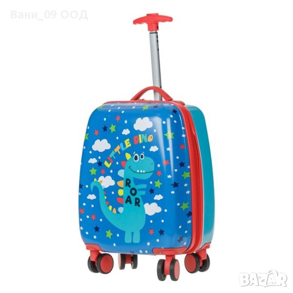 Детска раница-куфар с дизайн "динозавър", Т-образна дръжка, достигаща обща височина до 85 см височина и 4 двойни колела.