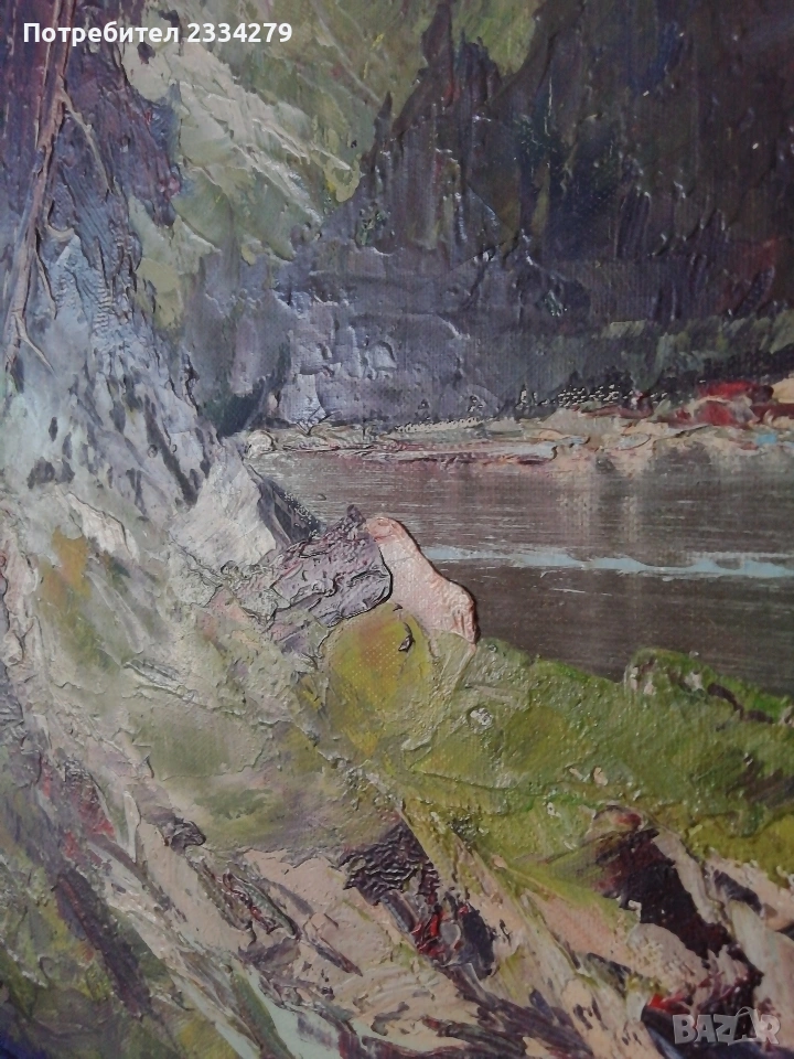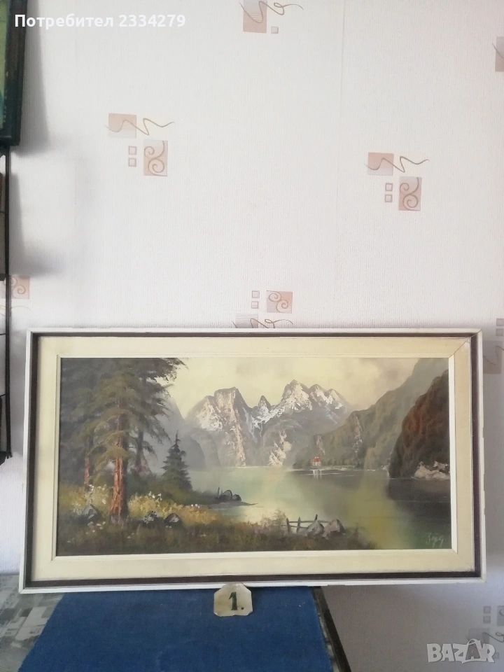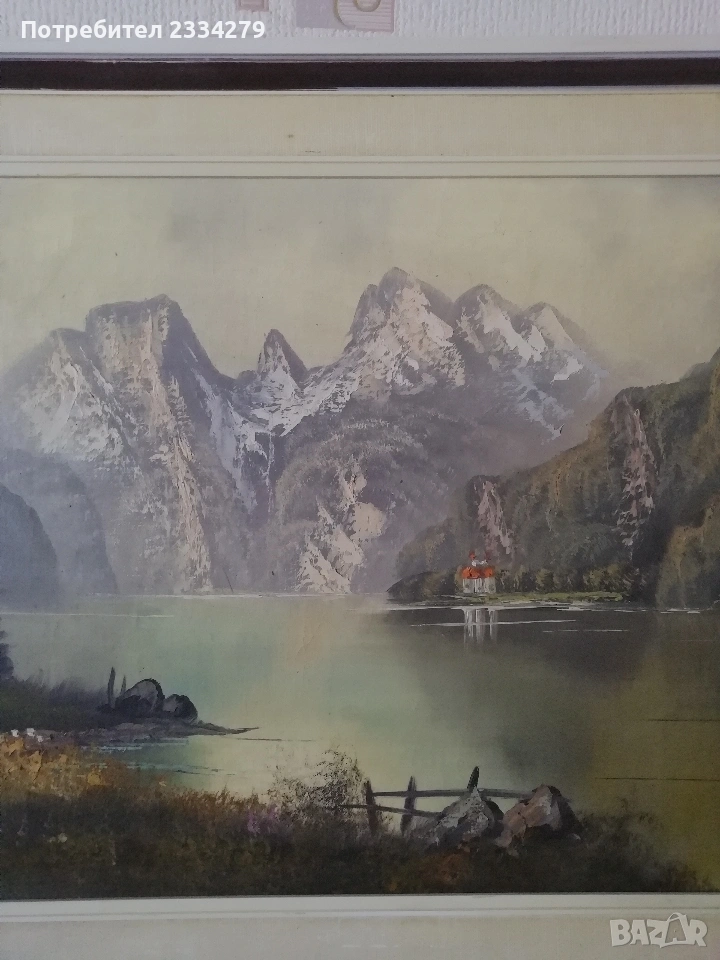 Номер едно и две: картини изобразяващи емблематичният алпийски пейзаж на езерото ,,Кьонигзее" в Бавария, Германия, с изглед към величествения връх Вецман (кътчето на художника) N:1 cтара картина класически реализъм, авторска ръчно рисувана върху платно с маслени бои и автограф на художника ,,Bogle" Карл Бьогле с надпис отзад и дата 4.12.1978год., поставена в дървена рамка 90х50см., цена 60€.; N:2 картина авторски пейзаж класически реализъм изпълнение от ХХвек. рисувана на платно с маслени бои, размери: 80х60см. към нея и дървена рамка, живопис с АВТОГРАФ на художника (Wtuger), цена 70€.; N:3 стара картина ,,Алпийски пейзаж", платно поставено в дървена, от горе елипсовидна, остъклена рамка с размери 60х50см., цена 30€.