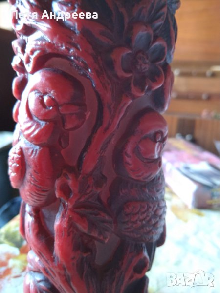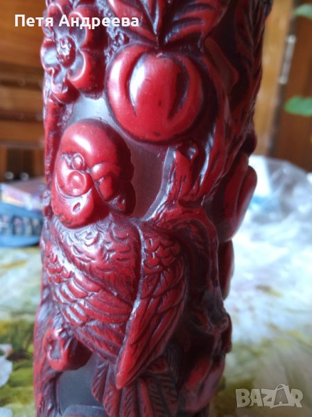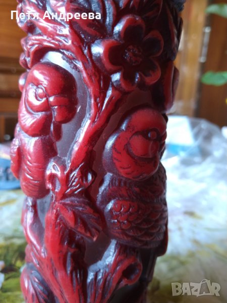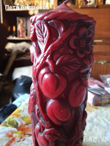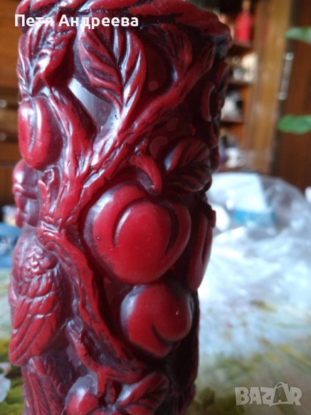 Красива декоративна свещ с два папагала, ябълки и цветове. Вишнево червен цвят. Височина 23 см, диаметър 8 см.