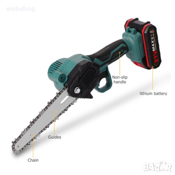 Ръчен електрически верижен трион от закалена стомана. Уредът има дълъг експлоатационен живот и е изключително стабилен, лесен за работа и ефективен. Презареждаща се литиева батерия с голям капацитет от 3000 mAh. Функция за автоматично впръскване на масло и регулиране скоростта. Предлага се в син цвят и с кутия за съхранение, в която има резервни части, батерия и отвертка.