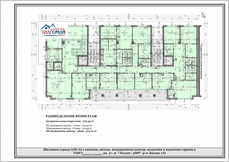 МЕДИЦИНСКИ ЦЕНТЪР за групова практика с медиц. кабинети: 14 бр. за първична (специализ. медиц. и дент.) помощ на две нива, със самостоятелен вход без връзка с жилищната част на сградата. Двете нива се свързват помежду си посредством стълбище, предвиден е и асансьор за инвалиди. Голяма тераса на ет. 2.