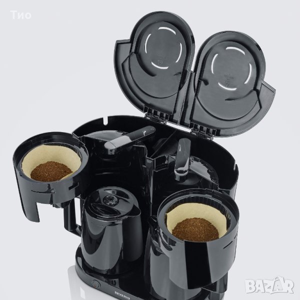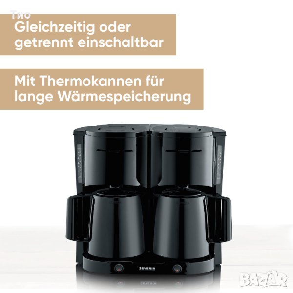Двойна машина за филтърно/шварц кафе SEVERIN KA 5829 Duo с 2 термосни кани, което позволява да се поддържа готовото кафе горещо за дълго време.