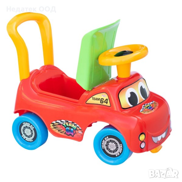 Състезателна кола Strata в червено със сини големи колела, предпазен гръб и седалка, която се отваря и става място за съхранение. Това е безопасна и издръжлива конструкция за безкрайни часове забавление в първите стъпки на детето.