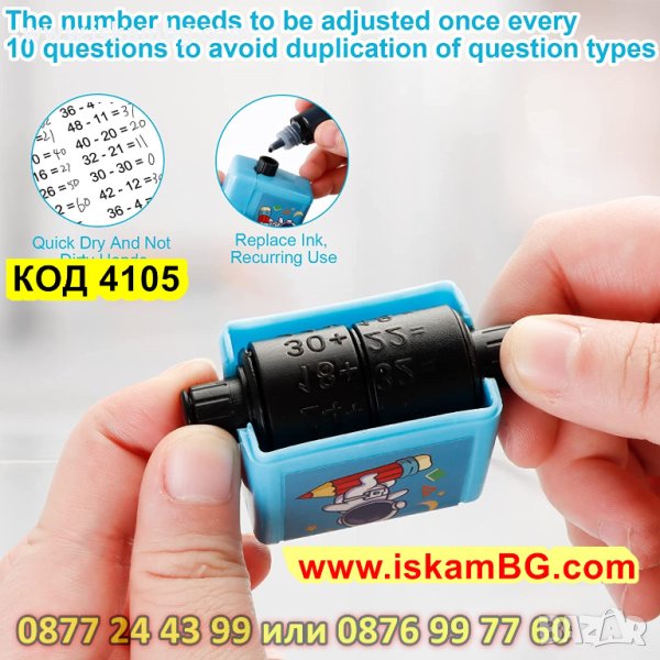Детски изчислителен печат, който ще подобри математическите умения у детето Ви! Печатът предлага множество от различни уравнения за събиране или изваждане с числа до 100. Необходимо е само едно плъзгане, за да имате различни уравнения за събиране или изваждане, а редът на числата се променя, завъртайки колелото от двете страни. Синият ролер е предназначен за събиране.