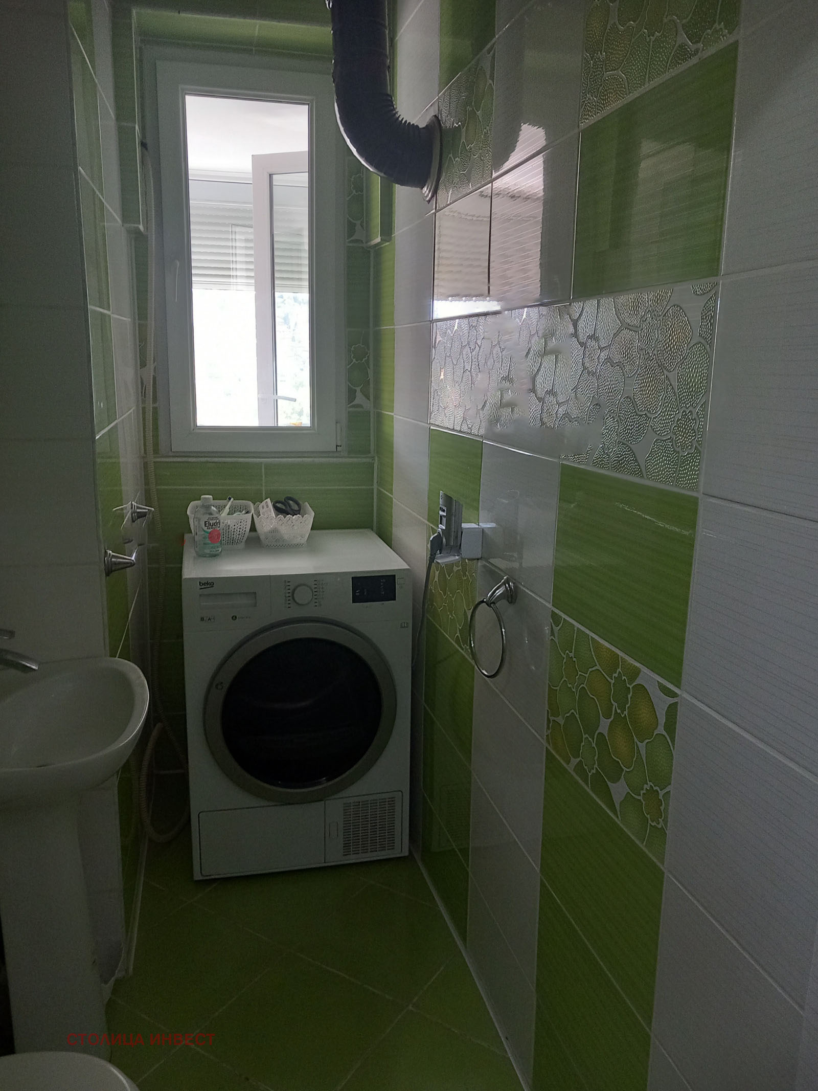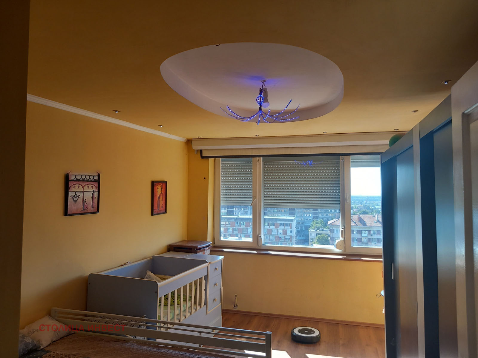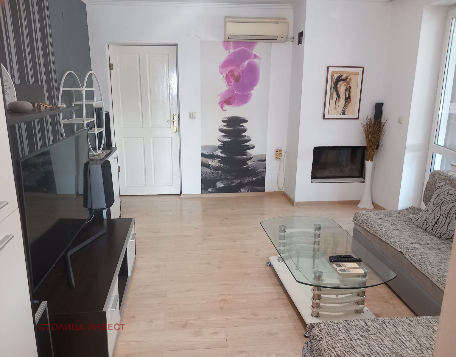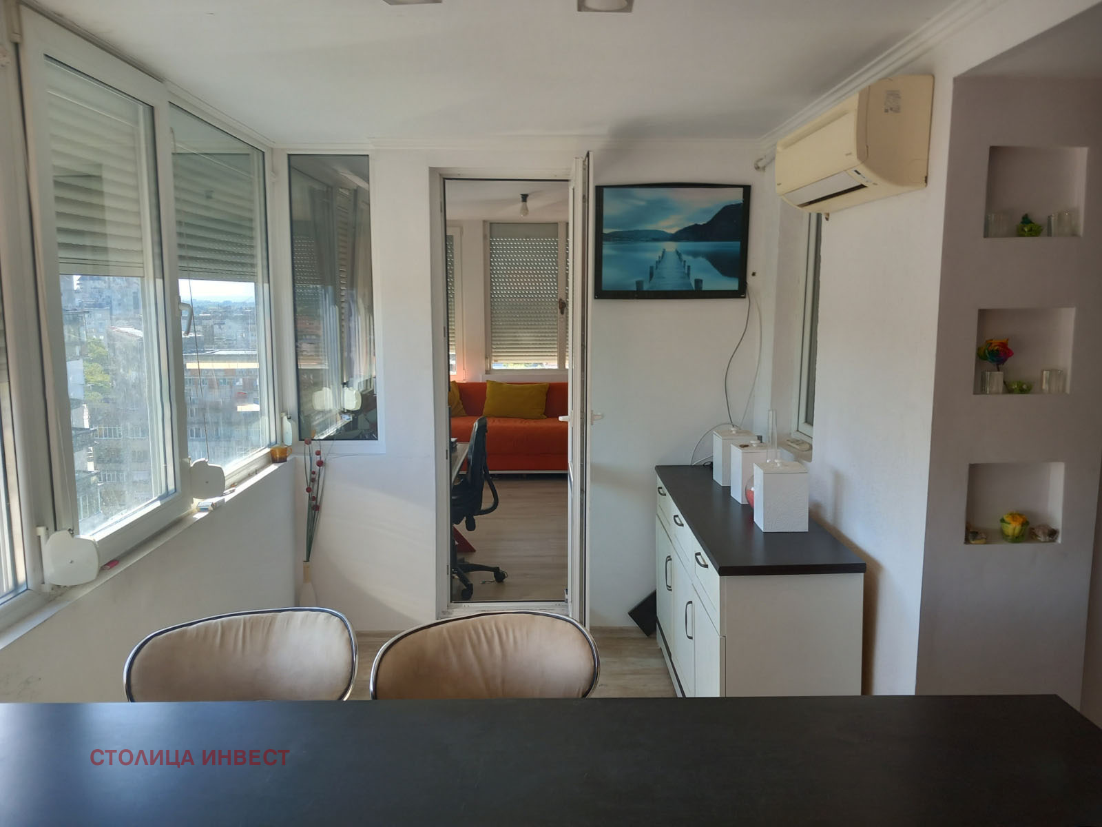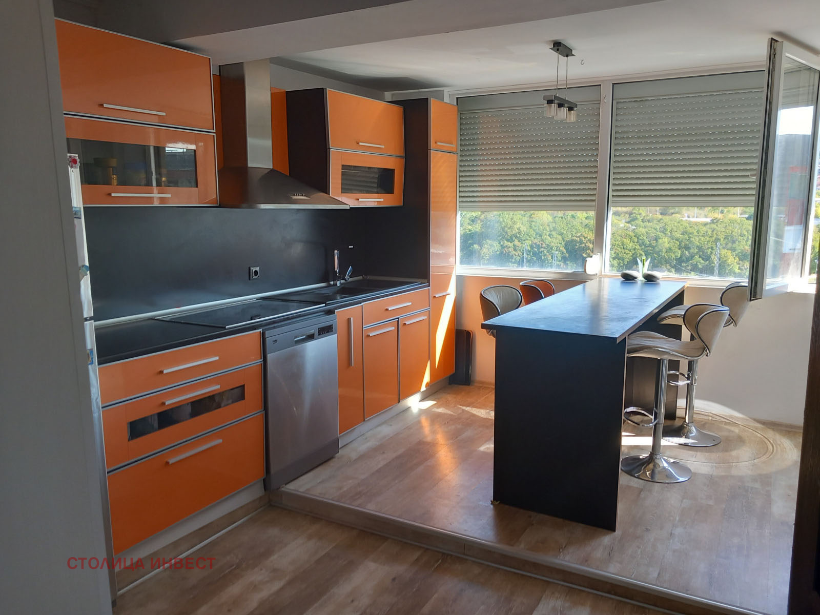 Агенция Столица Инвест предлага на Вашето внимание 3- стаен, напълно обзаведен апартамент в района на Автогара. Имотът е с площ 90 кв.м. и се намира на ет. 12 от общо 12 с асансьор. Жилището е на последен етаж, но с прекрасна панорамна гледка, с вътрешна изолация, PVC дограма, ролетни щори и напълно обзаведен с мебели и ел. уреди. А разпределението е от коридор, кухня с усвоена тераса, хол с излаз на остъклена тераса, спалня и баня и тоалетна отделно, а отоплението е с климатици, но има и други варианти, тъй като има изградена камина и отделно сградата е на ТЕЦ.