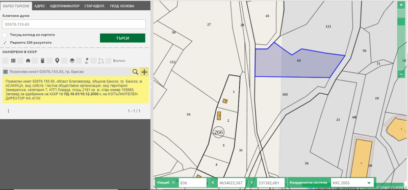 Поземлен имот 02676.155.65, област Благоевград, община Банско, гр. Банско, м. АСАНИЦА, вид собств. Частна обществени организации, вид територия Земеделска, категория 7, НТП Ливада, площ 2161 кв. м, стар номер 155065,