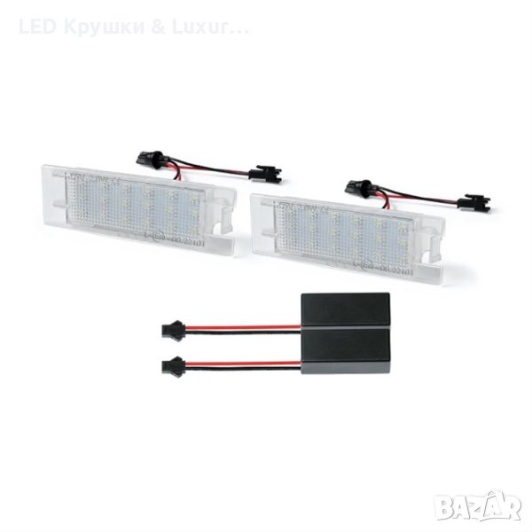 Светодиодни плафони за регистрационен номер с изключително високо качество на изработка и перфектно пасване на мястото на стандартните. Плафоните са оборудвани с ярко светещи диоди, които ще осветят перфектно вашия регистрационен номер. Основните предимства на LED плафоните са: ниската консумация и ярката светлина. Ако търсите промяна, изискан вид, силна светлина и надеждност, LED плафоните със сигурност ще покрият всяко едно от тези изисквания. След заменянето на стандартните ви плафони с LED, вие ще получите добре разпрашена, ярка светлина. Ако забравите включени LED плафоните, ниската им консумация няма да изтощи акумулатора.