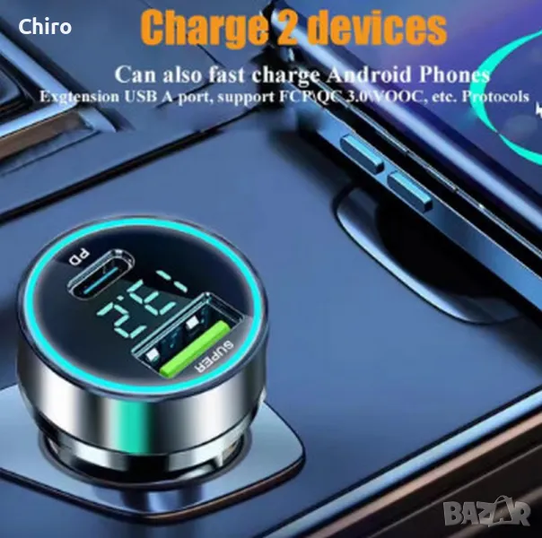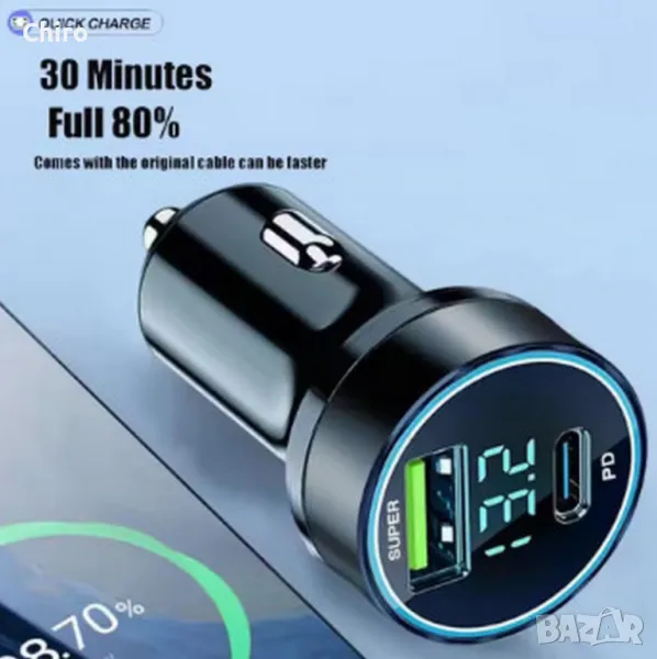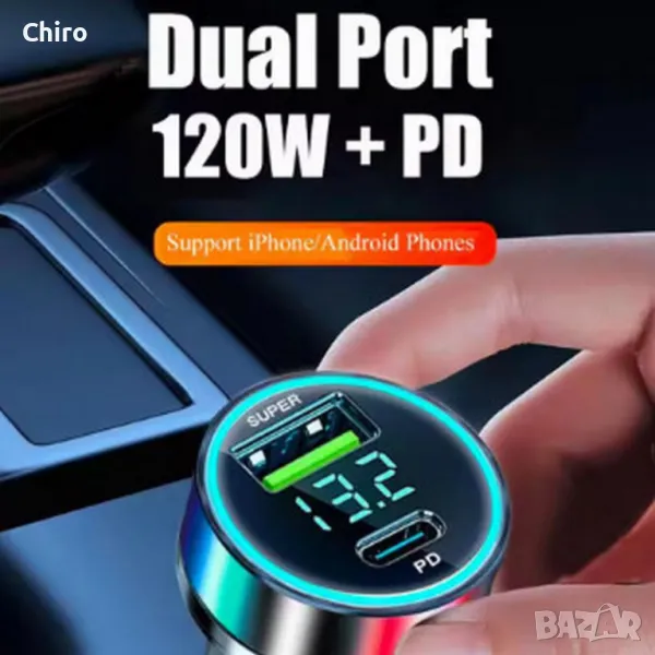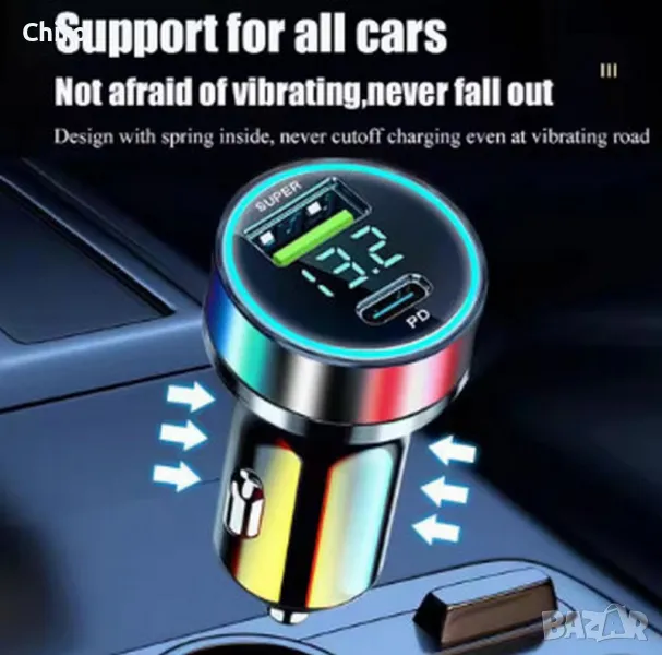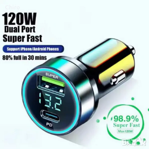 Зарядно устройство с 2 порта -за автомобили с акумулатори 12-24V Устройството е чисто ново, зарежда мобилни телефони, таблети и всички устройства ползващи стандартен USB-кабел както и USB-C за свързване, има вградени защити от късо съединение, прегряване, пренапрежение, презареждане. Включва се в стандартното гнездо на автомобилна запалка. Има индикация в реално време за напрежението на акумулатора на автомобила.