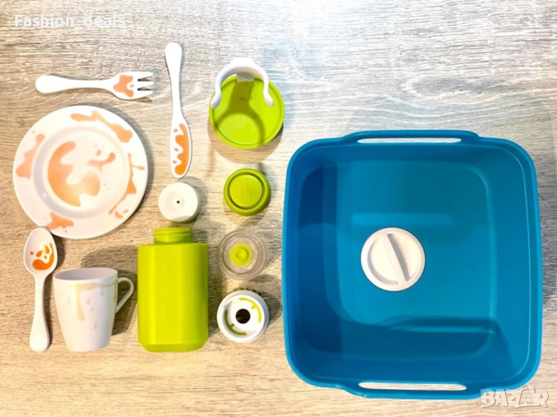 Включва купа за миене и отцеждане на съдове с палмово почистване, бутилка за сапун и различни чинии, чаши и прибори за хранене с променящо се мастило. Тези компоненти осигуряват на децата пълноценна игра.