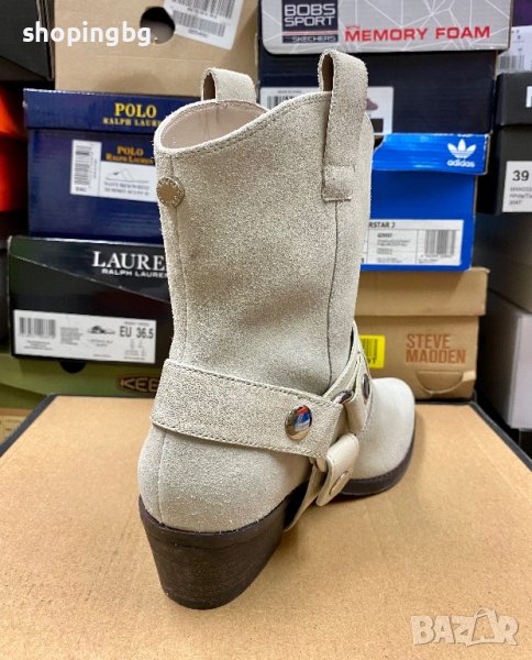STEVE MADDEN са ежедневни ботуши в каубойски стил, изработени от висококачествена кожа с увити около глезена колан с катарама, 4 сантиметровият ток ги прави удобни и лесни за носене през целият ден и нощ.
